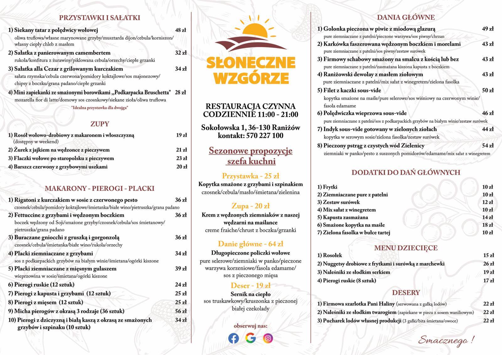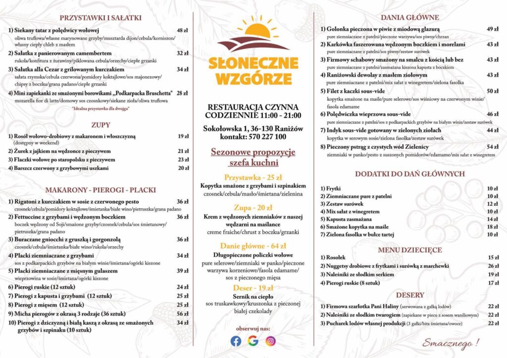 Zajazd , Restauracja Słoneczne Wzgórze w Raniżowie ZESTAW DNIA ZUPA DNIA + DANIE DNIACodziennie od poniedziałku od piątkuNasz Szef kuchni przygotowuje dla Państwa nowe, zróżnicowane zestawy dnia. Kontakt Restauracja Słoneczne Wzgórze 570 227 100